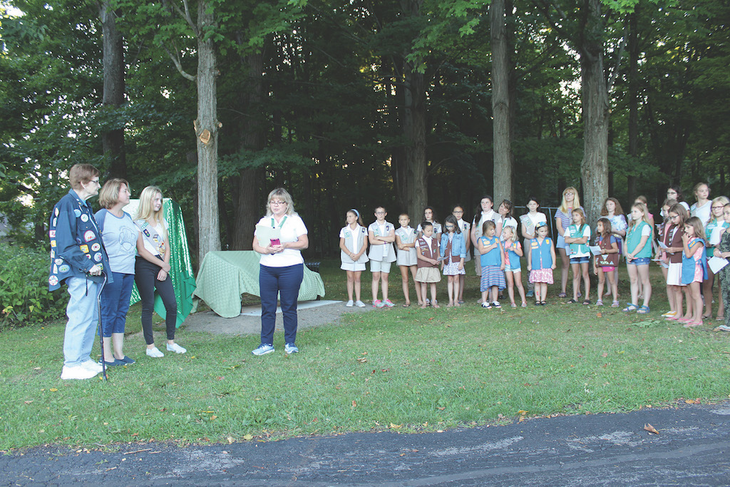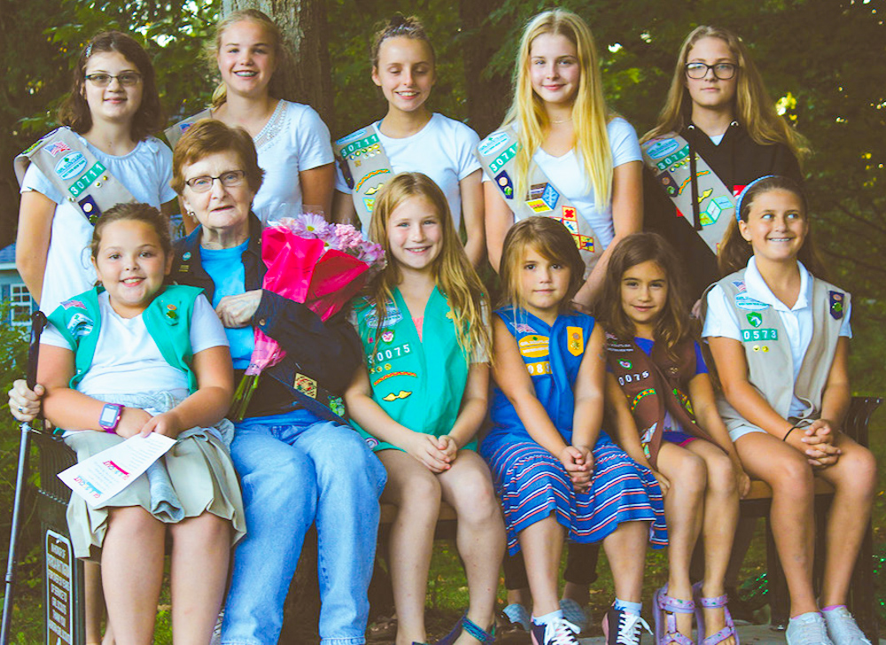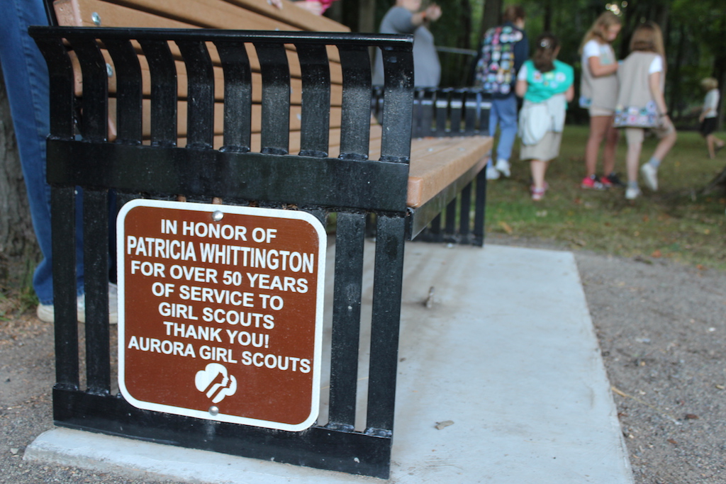 On Wednesday, August 28, 2019 the Girl Scouts in East Aurora recognized the retiring leader and volunteer by dedicating a Little Free Library and a park bench at the Aurora Community Pool Park at 690 South Street in her honor. A second bench was also installed to salute Girl Scouts of the past, present and future. Members of her family, friends, other leaders, and many of the Girl Scouts whose lives she touched were present for the surprise presentation.