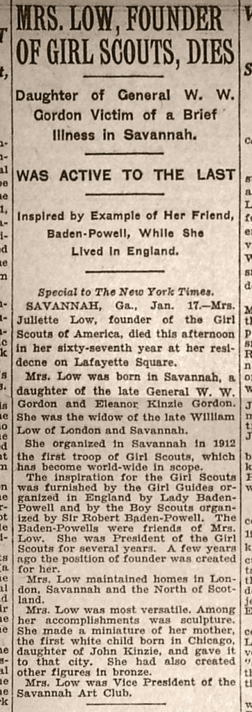 Today marks the passing of Juliette Gordon Low on January 17, 1927. The following obituary appeared in The New York Times the next day.