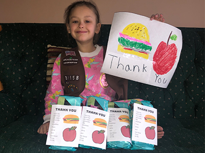 Troop 31158 from Clarence has taken several steps to earn the Give Back badge. With family and friends they raised funds to donate over 170 boxes of cookies to local nursing homes. On May 1, they celebrated School Lunch Superhero Day by giving each of the Cafeteria workers in their school district a box of cookies. This is Anna with the sign she made to thank the cafeteria workers.