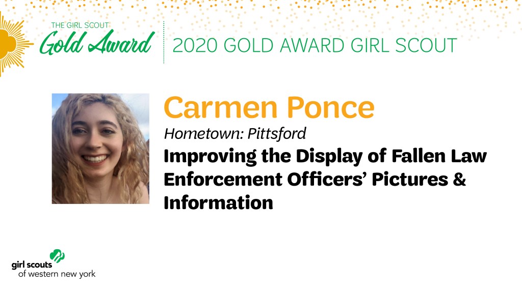 Girl Scouts of Western New York is proud to announce Carmen Ponce of Pittsford, NY, as a 2020 Gold Award Girl Scout. Ponce’s project is Improving the Display of Fallen Law Enforcement Officers’ Pictures & Information, and honors police officers, federal agents, troopers, sheriffs, and military personnel who died in the line of duty and have family members in the Genesee Valley area.