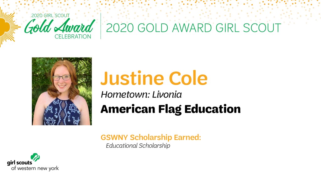 Girl Scouts of Western New York is proud to announce Justine Cole of Livonia, NY, as a 2020 Gold Award Girl Scout. Cole’s project, American Flag Education, involved educating grades K-5 on respect, history, and proper care of the American Flag in Livonia Elementary School.