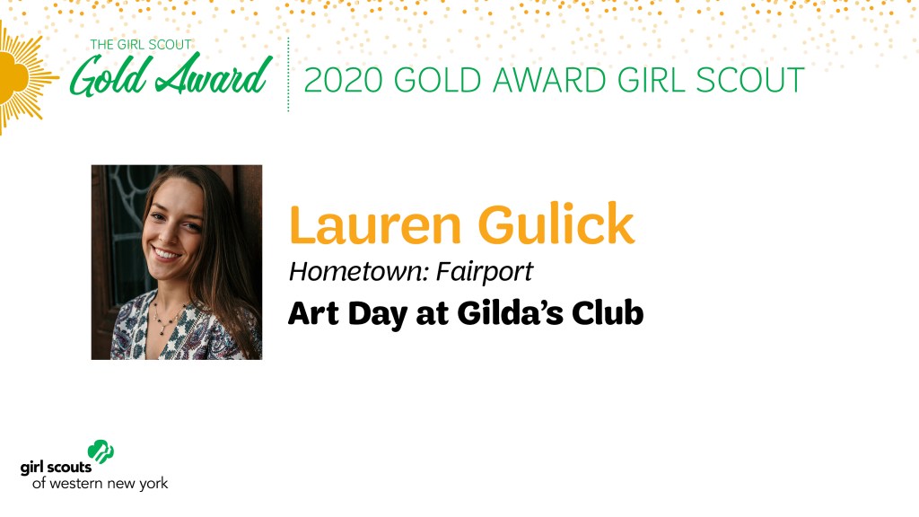 Girl Scouts of Western New York is proud to announce Lauren Gulick of Fairport, NY, as a 2020 Gold Award Girl Scout. Gulick’s project, Art Day at Gilda’s Club, hosted over 25 participants for a day of creativity.