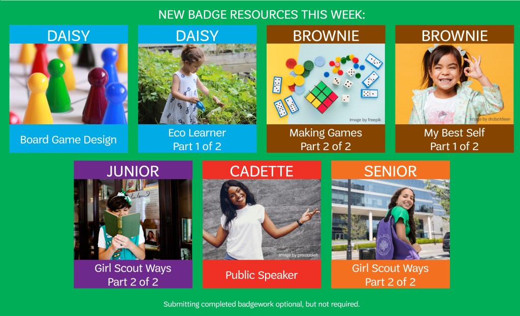 Looking for ways to stay involved with Girl Scouts? Check out our Girl Scouting at Home page today! We regularly add new resources, including new Virtual Badge Work for all Girl Scout Levels on Thursdays!