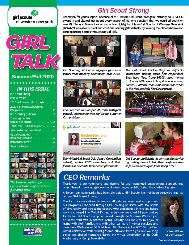 The Summer/Fall 2020 edition of Girl Talk is out with a focus on Girl Scout Strong! This issue features stories about what our Girl Scouts have been doing during the pandemic and how Girl Scouts has remained constant.