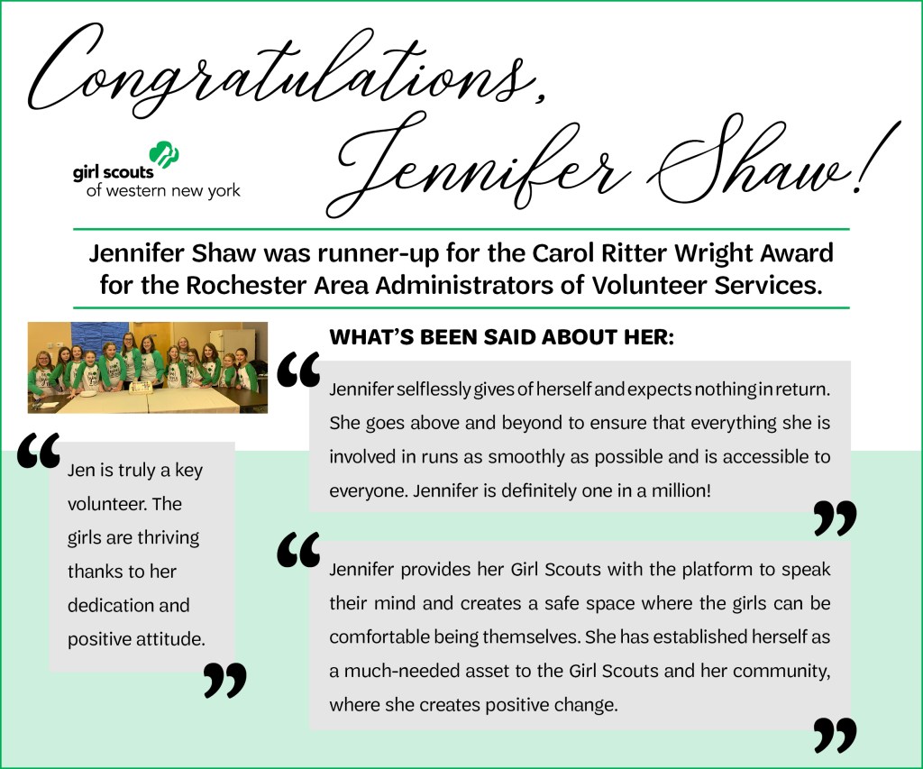If you know of a volunteer who was nominated for a Girl Scout Service Unit Award or a community award for their service to Girl Scouts, please send their name, volunteer role, a photo, and the name of the award to communications@gswny.org . Optionally you can also choose to include a brief quote explaining why the person deserves the award. We will work to create a social media post celebrating the award recipient to celebrate their achievement.