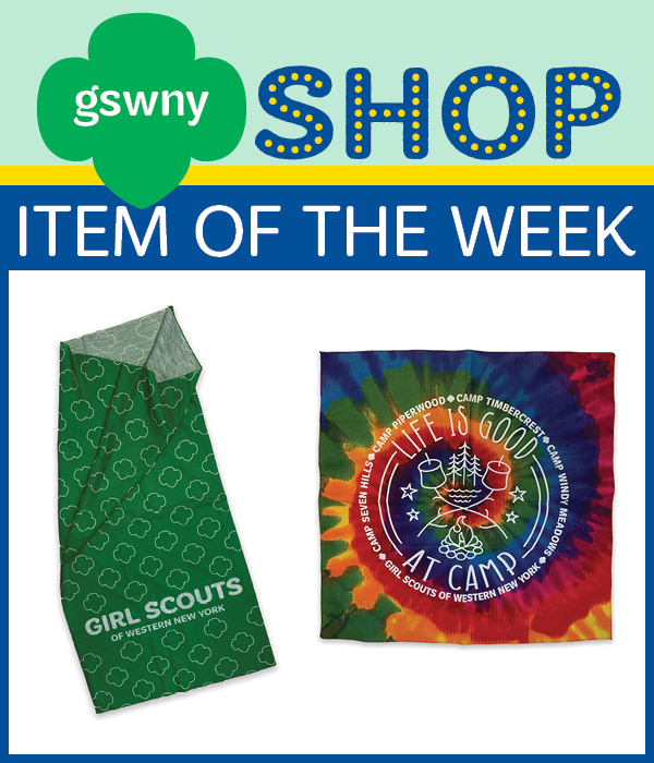 Also featured this week is the beautiful “Life is Good at Camp!” tie-dyed colored bandana with all four Girl Scouts of Western New York camp names on it. Remember to email your local shop with your order for curbside pickup.