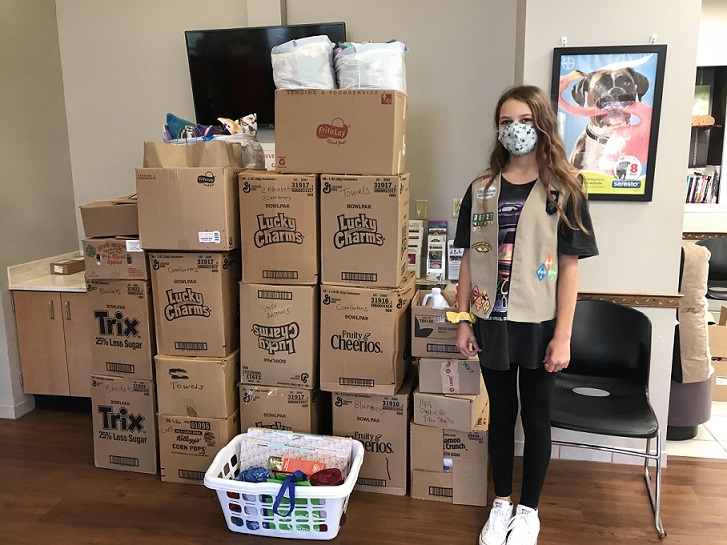 For her Silver Award Project, Catherine from Troop 30327 in Evans, New York, decided to help the animals at the Chautauqua County Human Society. She saved money and collected donations to buy supplies on the needs list, as well as making 39 T-shirt dog ropes, 25 cat beds, 18-noise-making Easter Egg cat toys, 18 water bottle dog toys, 12 pill bottle cat toys, 4 jean dog ropes, and other items. Click here to read more about her project and work.