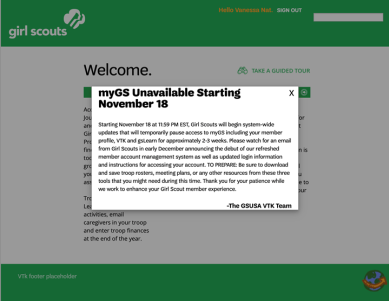 Starting November 18 at 11:59 PM EST, Girl Scouts will begin system-wide updates that will temporarily pause access to myGS including your member profile and the Volunteer Toolkit (VTK) for approximately 2-3 weeks. Please watch for an email from Girl Scouts in early December announcing the debut of our refreshed member account management system as well as updated login information and instructions for accessing your account.