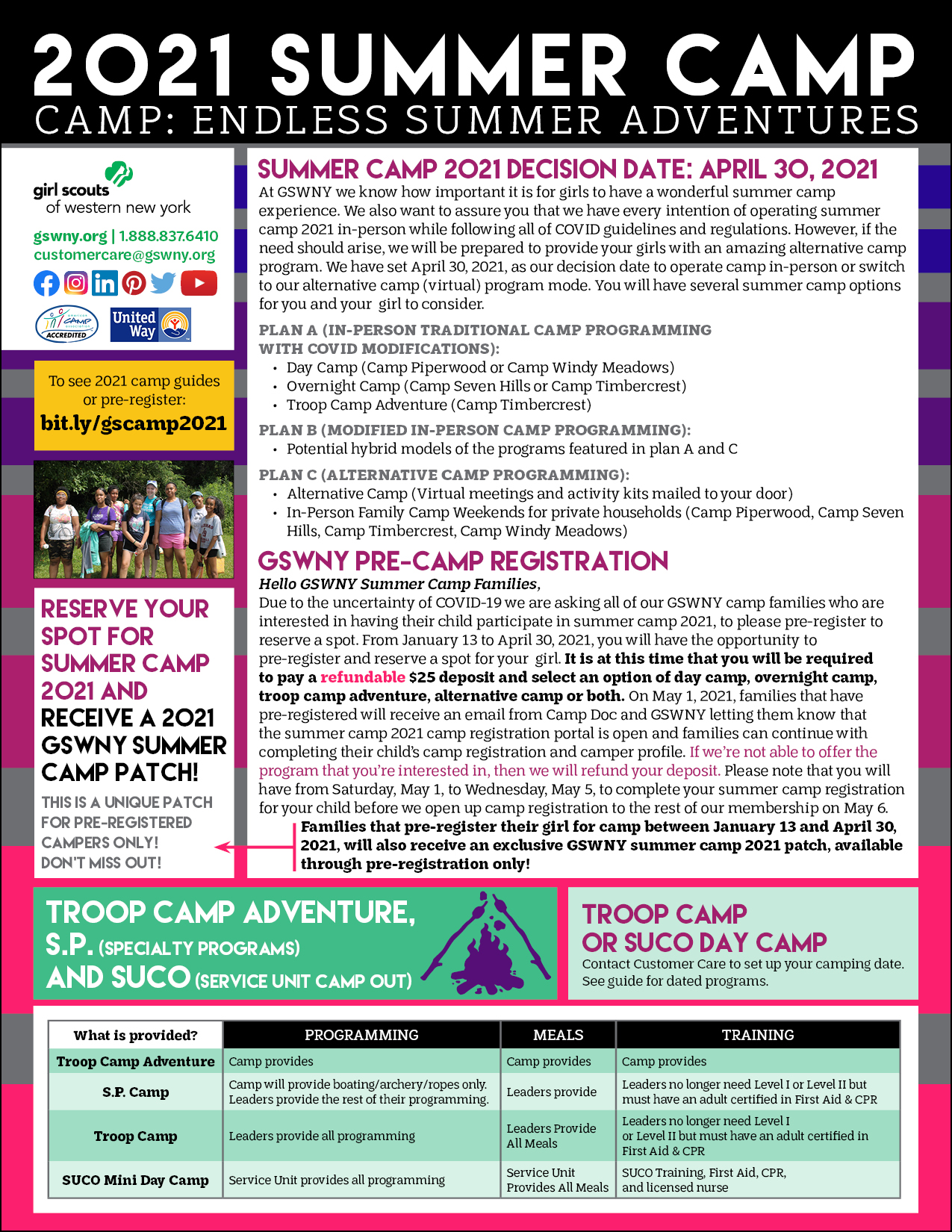 Due to the uncertainty of COVID-19 we are asking all of our GSWNY camp families who are interested in having their child participate in summer camp 2021, to please pre-register to reserve a spot. From January 13 to April 30, 2021, you will have the opportunity to pre-register and reserve a spot for your girl . It is at this time that you will be required to pay a refundable $25 deposit and select an option of day camp, overnight camp, troop camp adventure, alternative camp or both. The link will be available tomorrow at gswny.org.