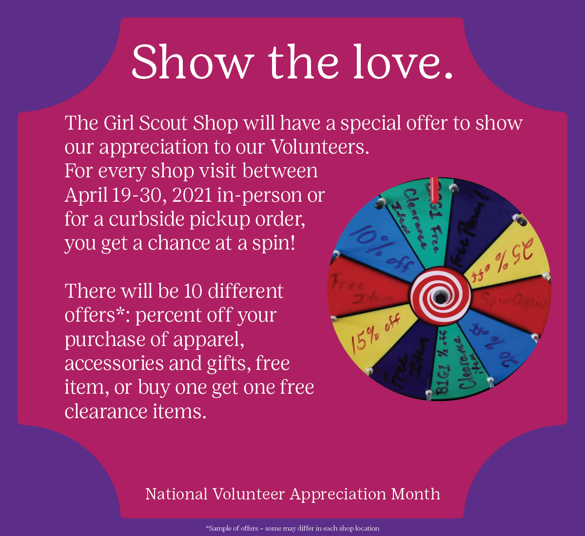 The Girl Scout Shop will have a special offer to show our appreciation to our volunteers!