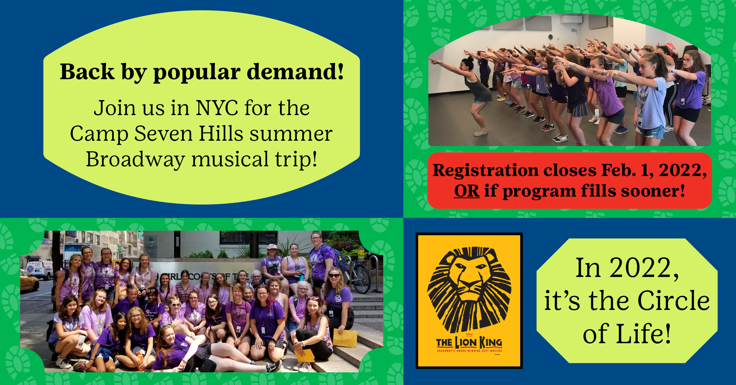 You will recreate a true Broadway rehearsal taken right from a scene of the famous musical. Time will be left to visit Madame Tussauds, NYC Girl Scout Central, along with a little shopping. Swimming, arts & crafts, s’mores, and the other staples of Seven Hills camp life are also included.