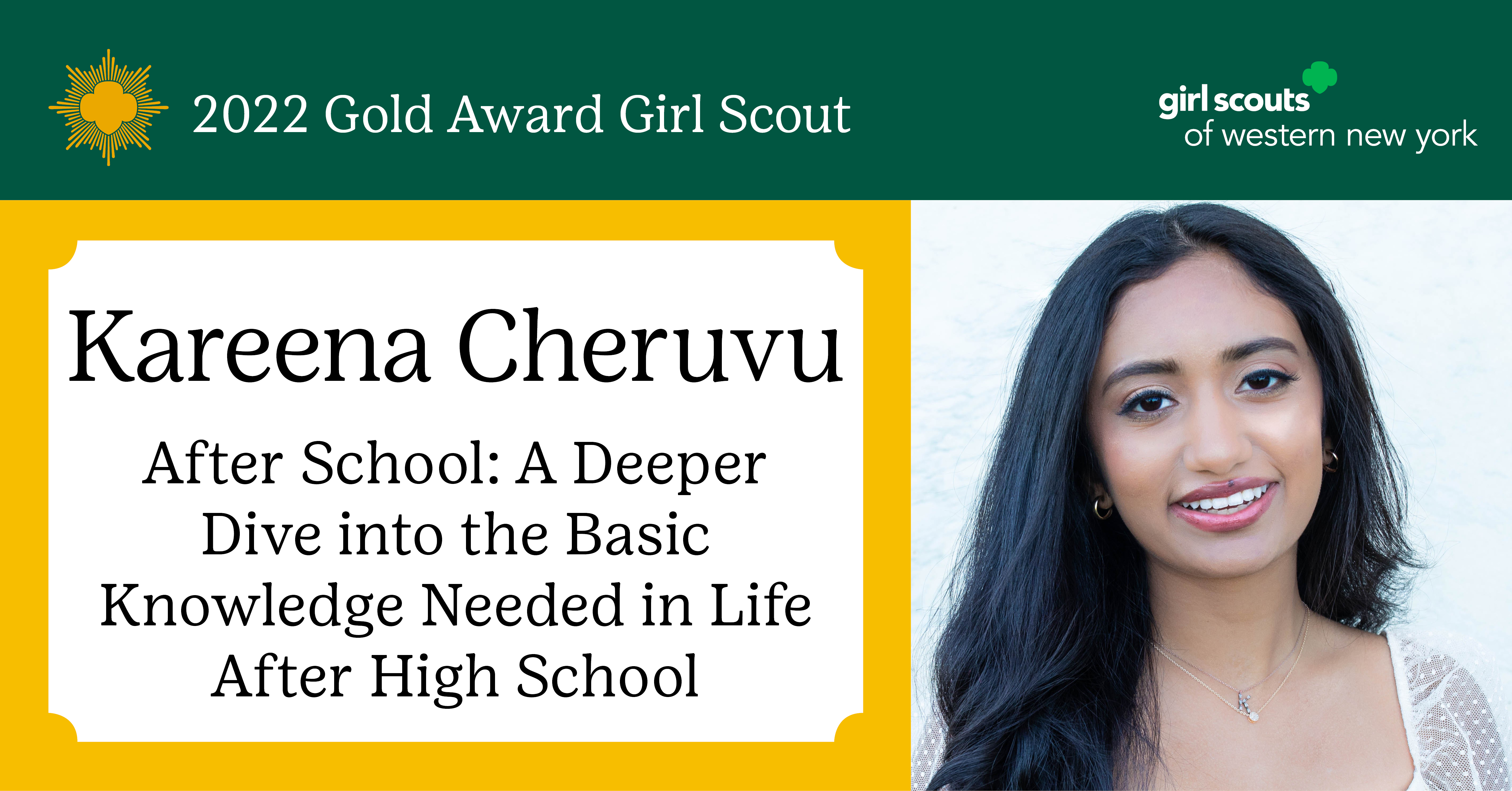 Girl Scouts of Western New York is proud to announce Kareena Cheruvu of Williamsville, NY, as a 2022 Gold Award Girl Scout. Kareena is a member of Troop 30345.