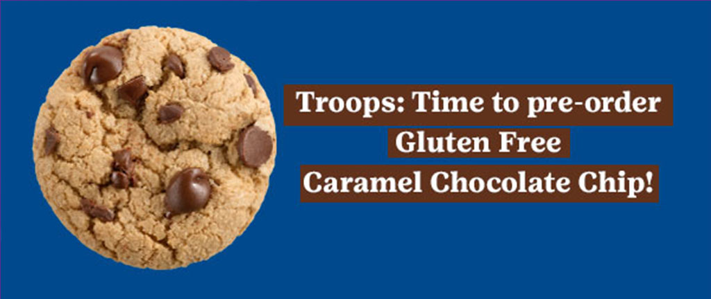 Troops must pre-order their supply of Gluten Free Caramel Chocolate Chip Cookies in advance of our normal ordering and selling period. This pre-order is required by ABC Bakers due to the special requirements of gluten free products.